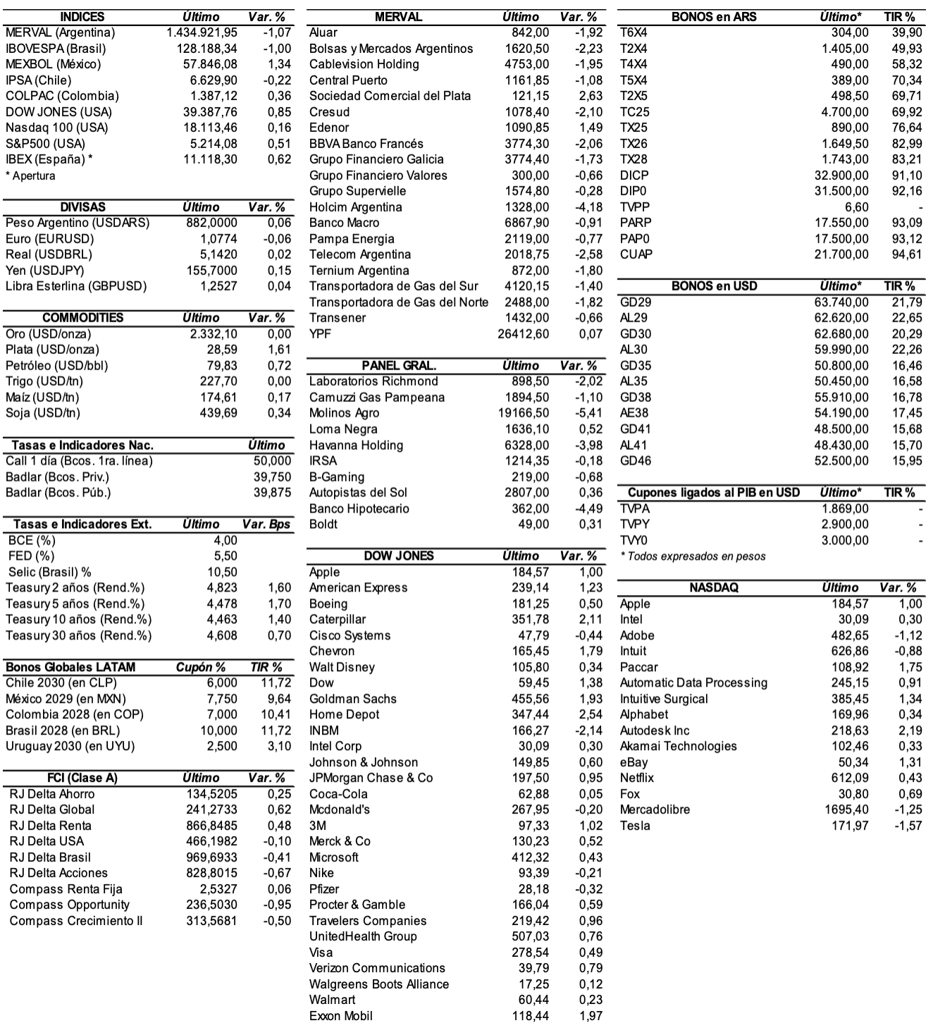 En el exterior, las acciones argentinas ADRs cerraron la semana pasada con mayoría de alzas. Sobresalieron: IRSA (IRS) +12,9%, Telecom Argentina (TEO) +10,4%, Edenor (EDN) +8%, Bioceres (BIOX) +6,3%, y Vista Energy (VIST) +5%, entre las más importantes.