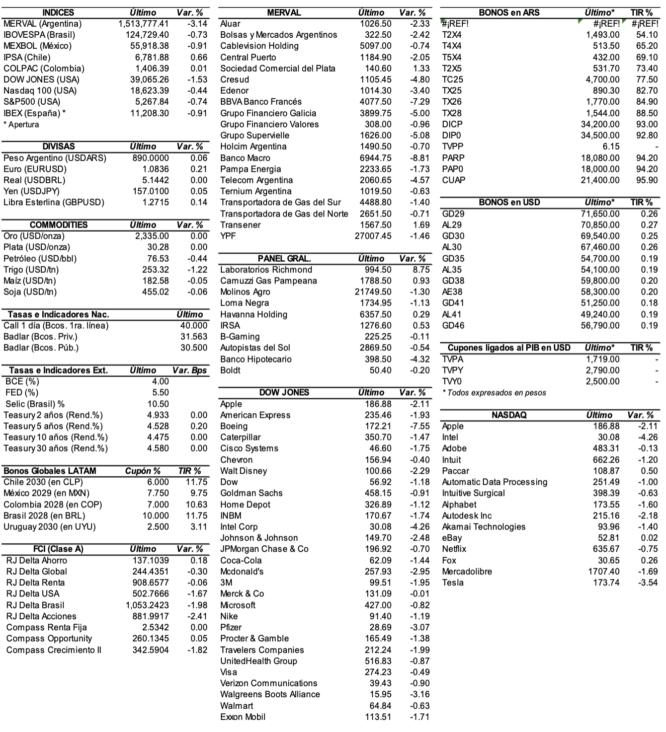 Las acciones que más cayeron fueron las de: Transportadora de Gas del Sur (TGSU2) +3,3%, Ternium Argentina (TXAR) -3%, Aluar (ALUA) -2,9%, Cresud (CRES) -2%, y Bolsas y Mercados Argentinos (BYMA) -1,5%, entre las más importantes.
