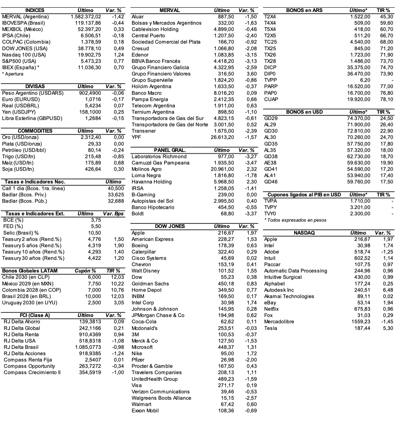 Cayeron: Globant (GLOB) -2,4%, Ternium (TX) -1,9%, y Adecoagro (AGRO) -1,4%, entre otras.
