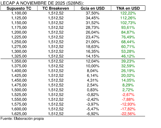 La LECAP a noviembre 2025 (S28N5), con precios del viernes pasado, rinde una TNA de 43,89%, es decir una tasa efectiva de 13,47% hasta el vencimiento (112 días).