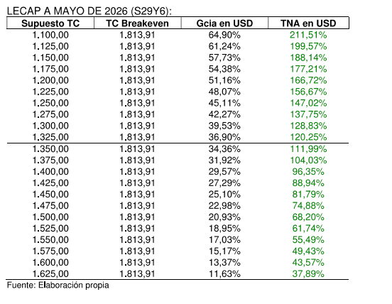 La LECAP a mayo de 2026 (S29Y6), con precios del viernes pasado, rinde una TNA de 44,79%, es decir una tasa efectiva de 36,08% hasta el vencimiento (294 días).