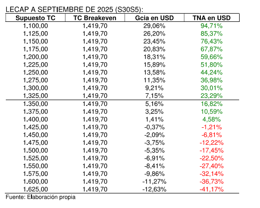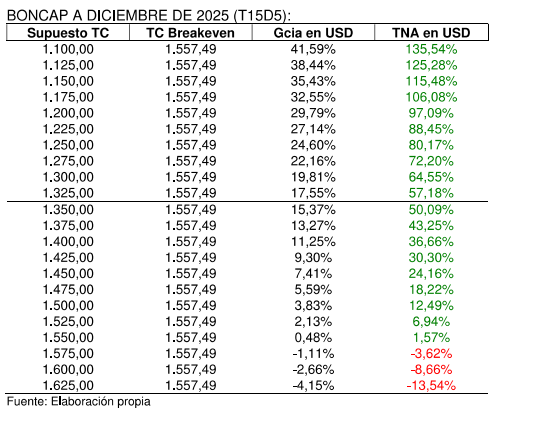 Para esta simulación, tomamos en cuenta las LECAPs a septiembre de 2025 (S30S5), a noviembre de 2025 (S28N5) y a mayo de 2026 (S29Y5), y el BONCAP a diciembre de 2025 (T15D5).